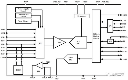 领慧立芯推出的LH001-55, 是一款低噪声 24 位Σ△ADC,提供完整的高分辨率测量解决方案。最高有效位达(ENOB)可达到23位。集成多路选择 MUX 和增益可调 PGA,可灵活处理差分或单端信号。可编程滤波器允许用户在分辨率和输出速率之间做最优的选择。芯片内部集成了可编程激励电流源以及温度传感器。同时集成了 12 位电压输出型 DAC。4-线SPI 接口,支持菊花链扩展多路 ADC 实现同时采样。图2位芯片的结构框图。该芯片还有一个亮点就是在正电源电压的条件下可以精准测量小于-0.1V的绝对负压信号。